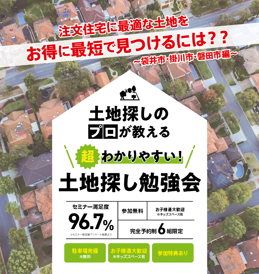 土地のことを知ることで「良かった!」と思える土地を手に入れましょう。その為に必要な情報を無料で手に入れられる勉強会です。是非ご参加ください。