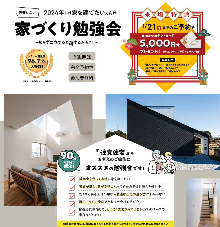 袋井市、磐田市、掛川市でお家をお考えの方、ぜひこのイベントで地域に根差したアドバイスを受けてみてください。そして、1月21日までのお申し込みで、Amazonギフト券5,000円分がもらえる特典も!