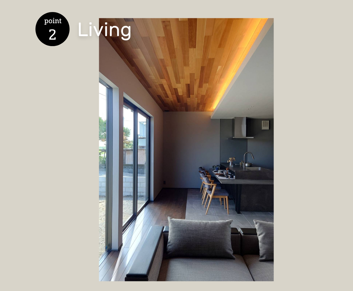レッドシダーの天井と間接照明が、温かなムードを創り出すリビング。開放感のある広々とした空間で、家族と共にリラックスしたひとときを過ごすことができ、心地よい上質な空間が広がります。