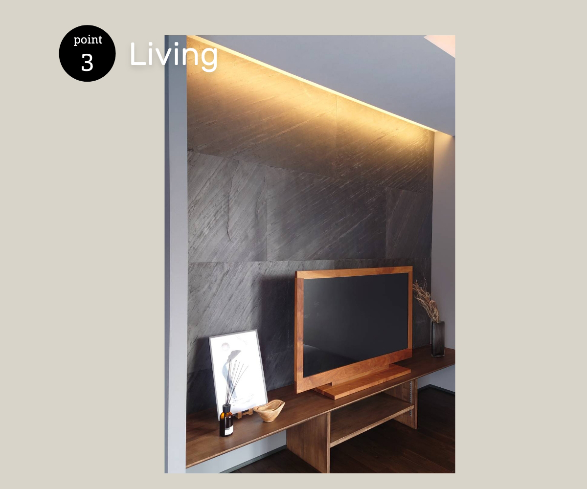 黒とグレーを基調とし、高級感ある石材を使ったアクセントウォールが印象的。間接照明がラグジュアリーな雰囲気を引き立て、全体のデザインに統一感をもたらします。上質な空間で暮らしを豊かに。
