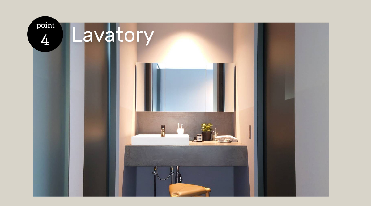 グレーを基調にした左官仕上げの造作洗面化粧台が、大人の落ち着いた雰囲気を醸し出します。ゆとりあるサイズと高級感のある質感が特徴で、シンプルで使い勝手が良く、掃除も簡単です。