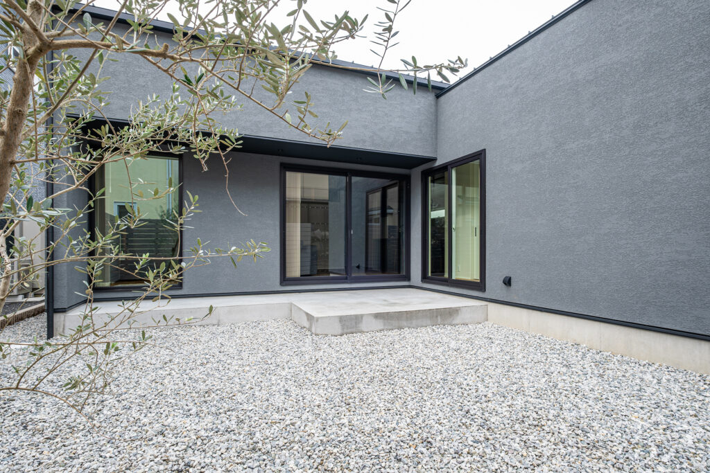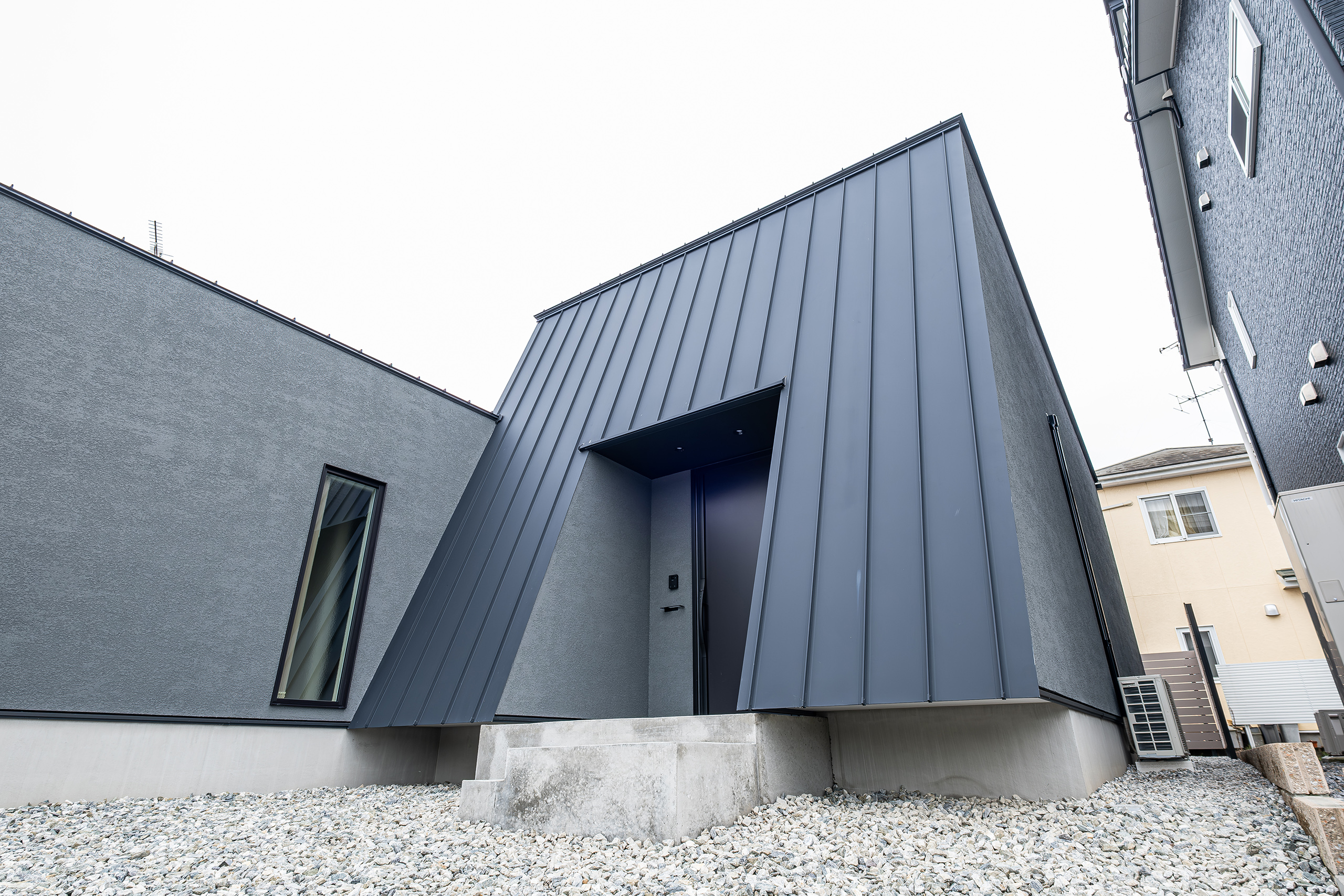 誰もが振り返る個性的な外観を持つこの平屋は、塗り壁とガルバリウム鋼板の洗練された組み合わせで、高級感とぬくもりを両立。