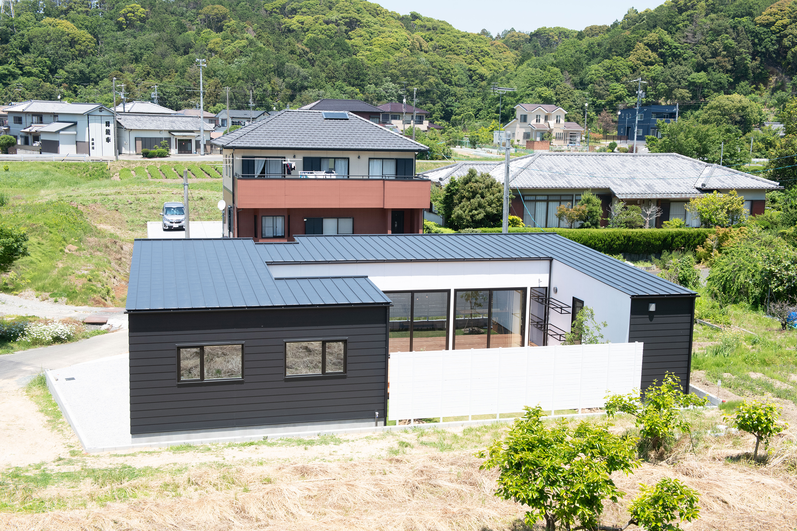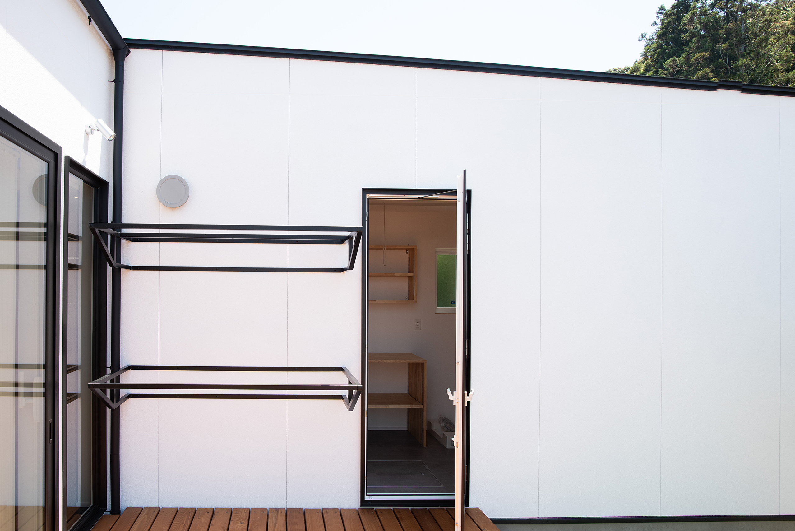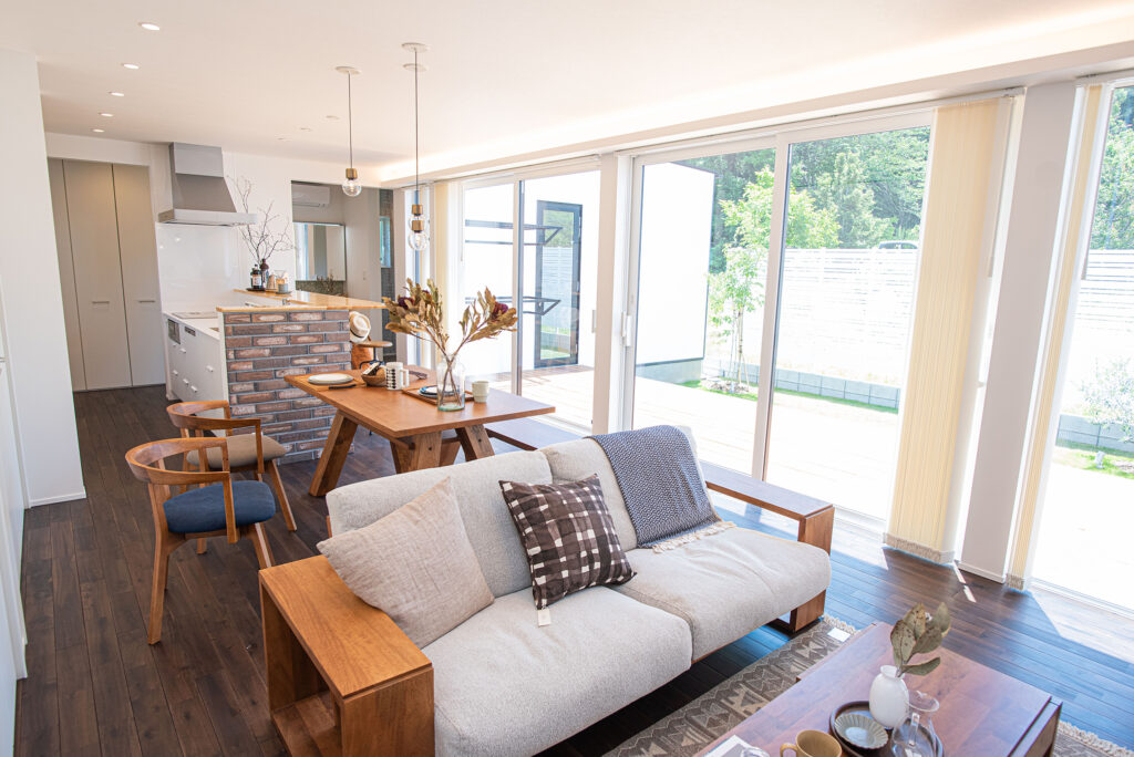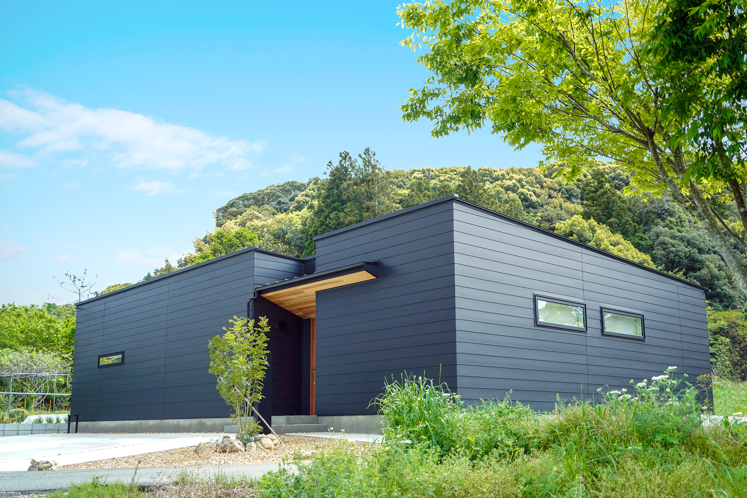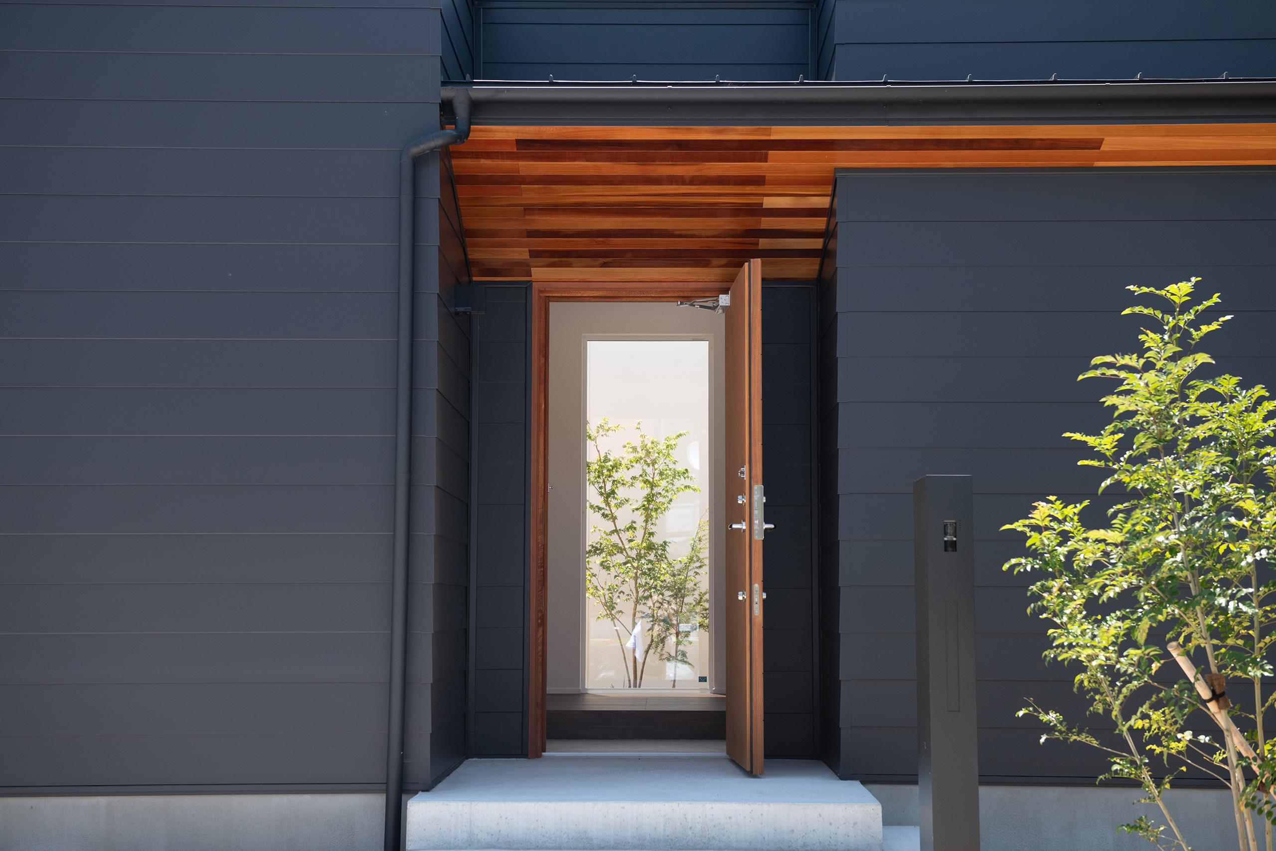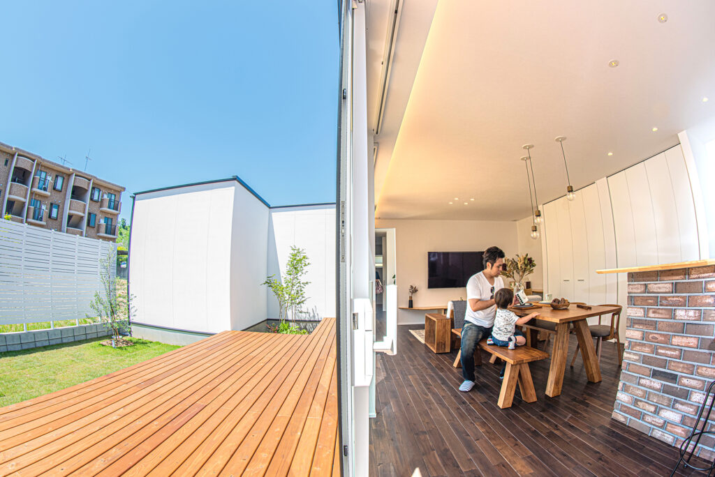 背中に山を背負うコの字型の住宅は、ドアを開けると植栽がお出迎えします。そのすぐ先には、小さな中庭が広がり、室内と一体となって開放感を醸し出します。LDKとデッキが一体となっており、アウトリビングが可能。ここはプライヴェートスペースで、他人の視線を気にせずに子供と遊ぶことができ、友人とのBBQも楽しめます。