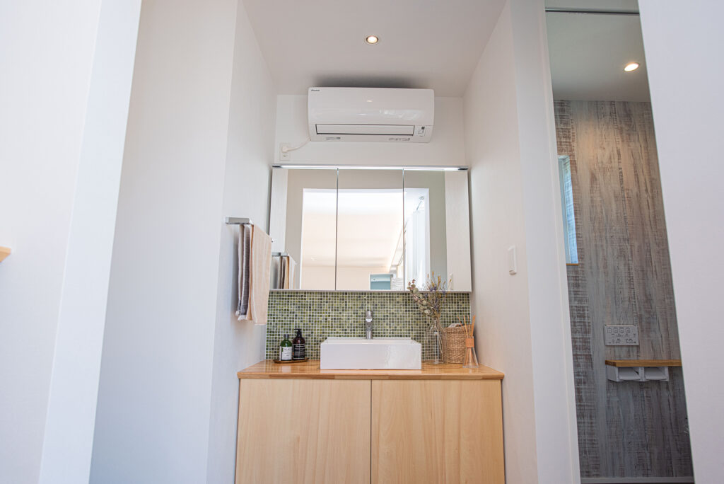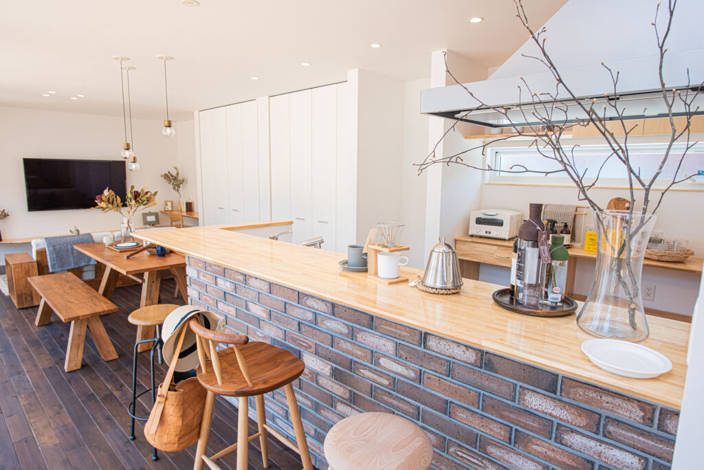 キッチンには、ブルックリンタイルをあしらったハイカウンターが特徴。隣接する土間収納は大容量で、家事動線もスムーズに。脱衣所から物干しスペースまでを一直線につなぐ設計は、毎日の家事を助けます。造作洗面台には、ご自身で好みのタイルを選ぶことが可能です。