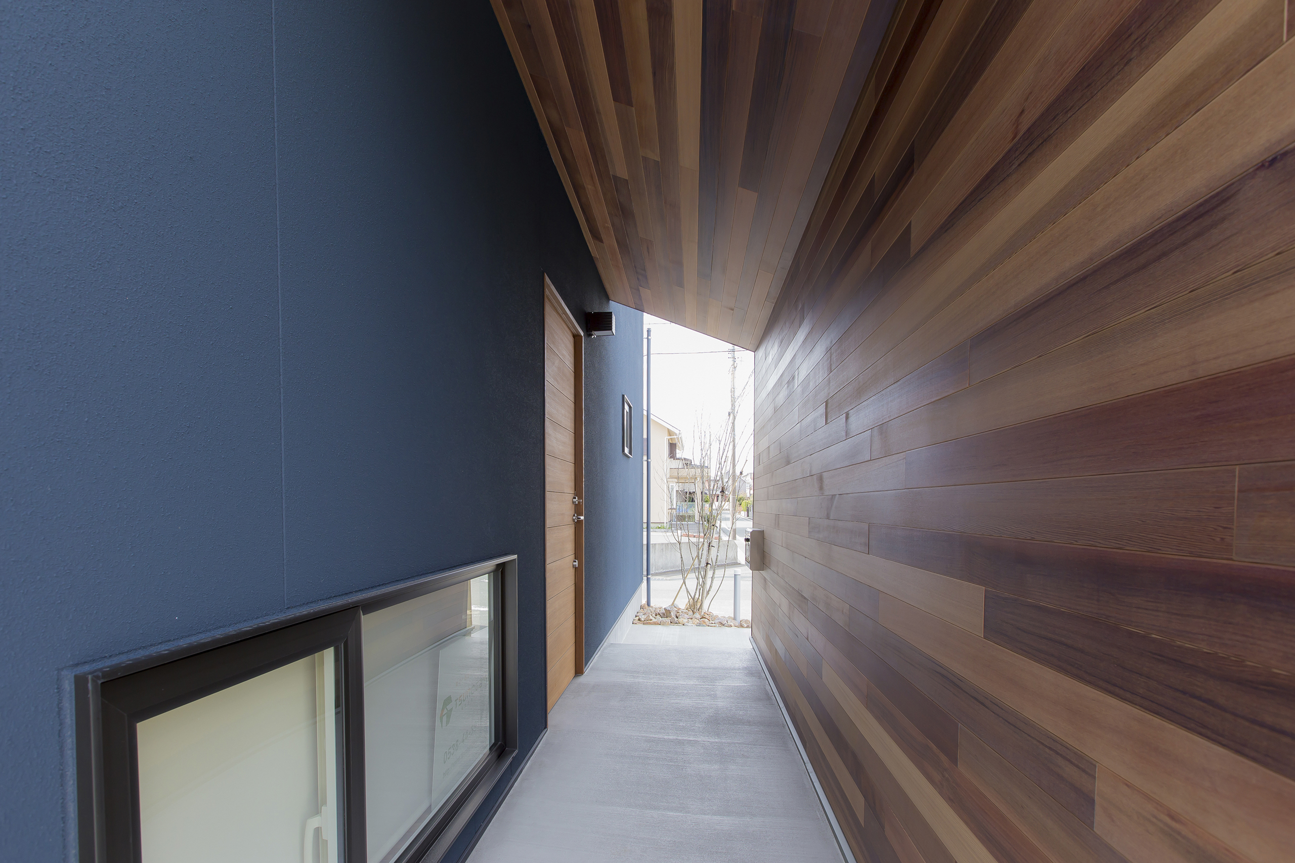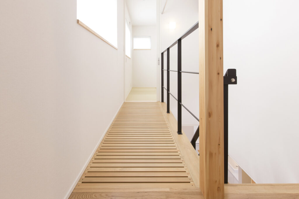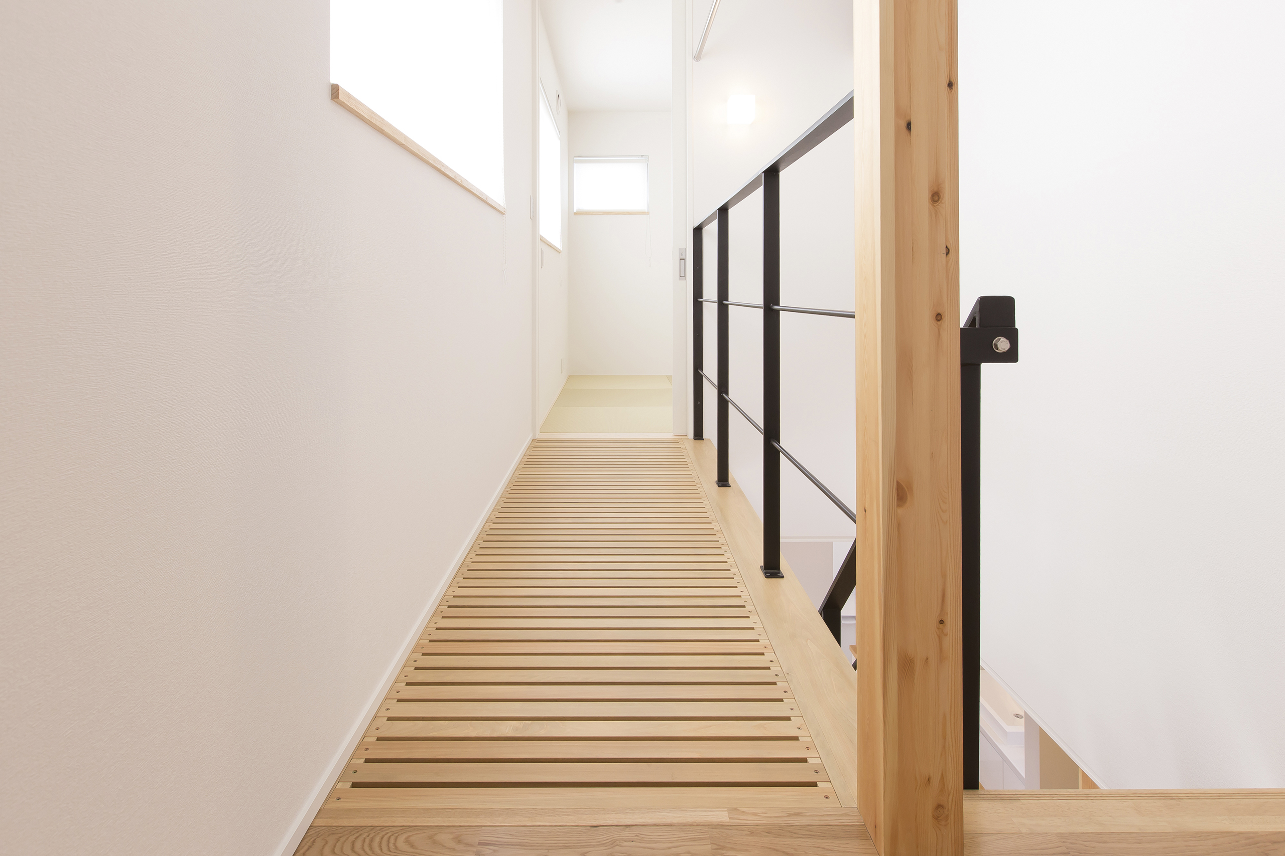住宅地の角地に誕生したこのお家は、エントランスとLDKの一体化により、広々とした開放感を実現しています。玄関を一歩踏み入れると、3方向へと広がる動線がお出迎え。家事動線にこだわった間取りや、リビングに広がりを持たせた和室配置が家族の日常を豊かに彩ります。明るく落ち着きあるLDKは、大開口からの自然光と、勾配天井の効果でより広々とした空間を生み出しています。2階の廊下は、アイアン階段とオリジナル造作TVボードで空間を引き締めつつ、格子形状の床が下階への明るさと空気の循環を確保します。