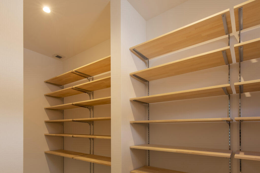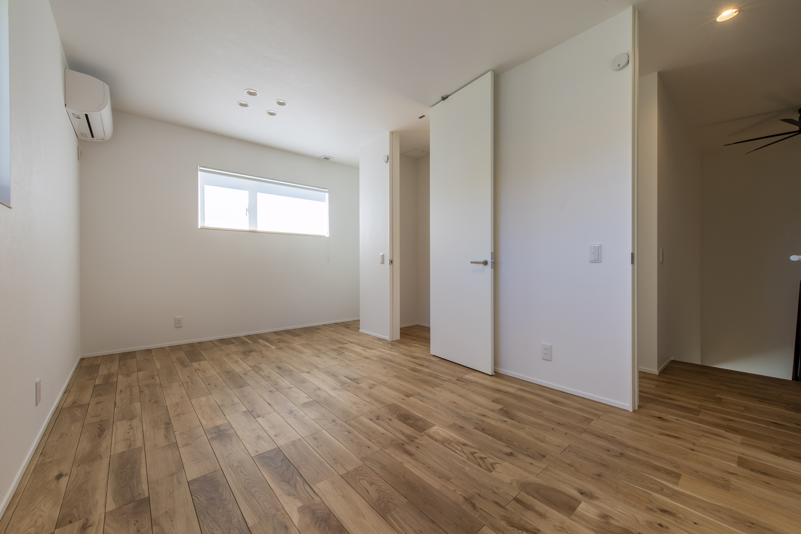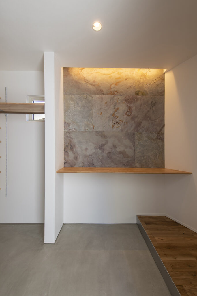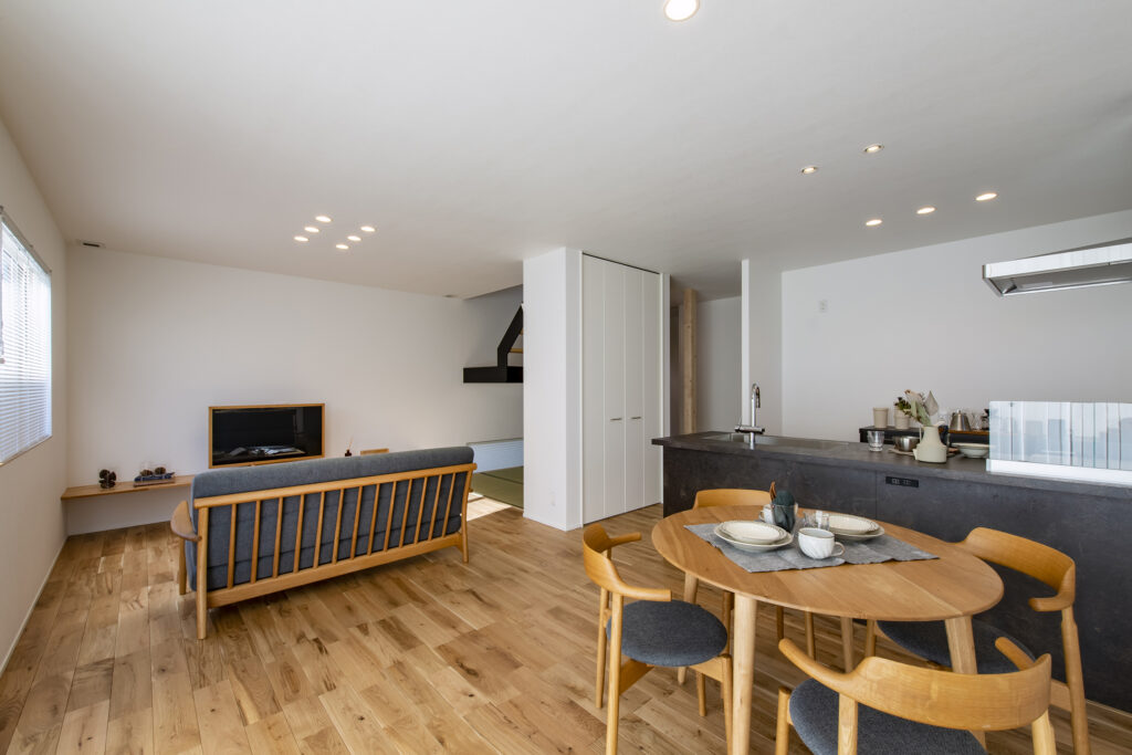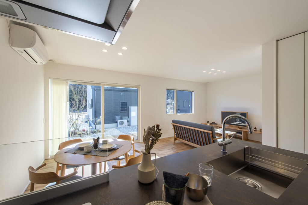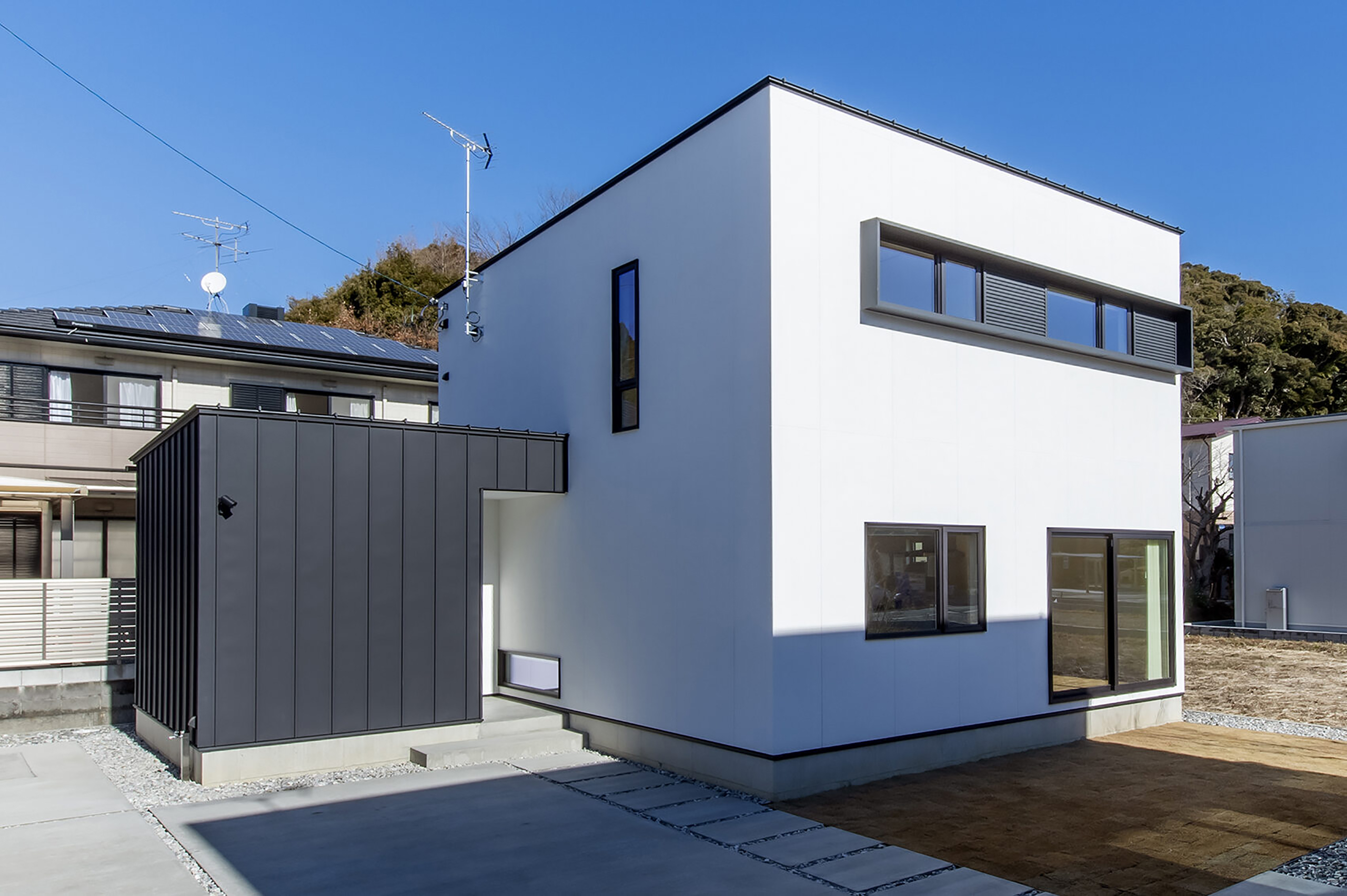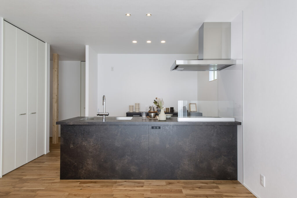シャープなフォルムと白と黒のコントラストが特徴。青空に映える外観は、通り過ぎる人の視線を一瞬で奪います。隠れたような玄関は、一歩足を踏み入れるとミニマルながらも木や石の自然の温かみに包まれるプライベート空間が広がります。大容量の土間収納やインパクトのある玄関は、生活を豊かに彩るだけでなく、機能性も考慮されています。