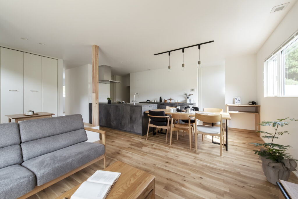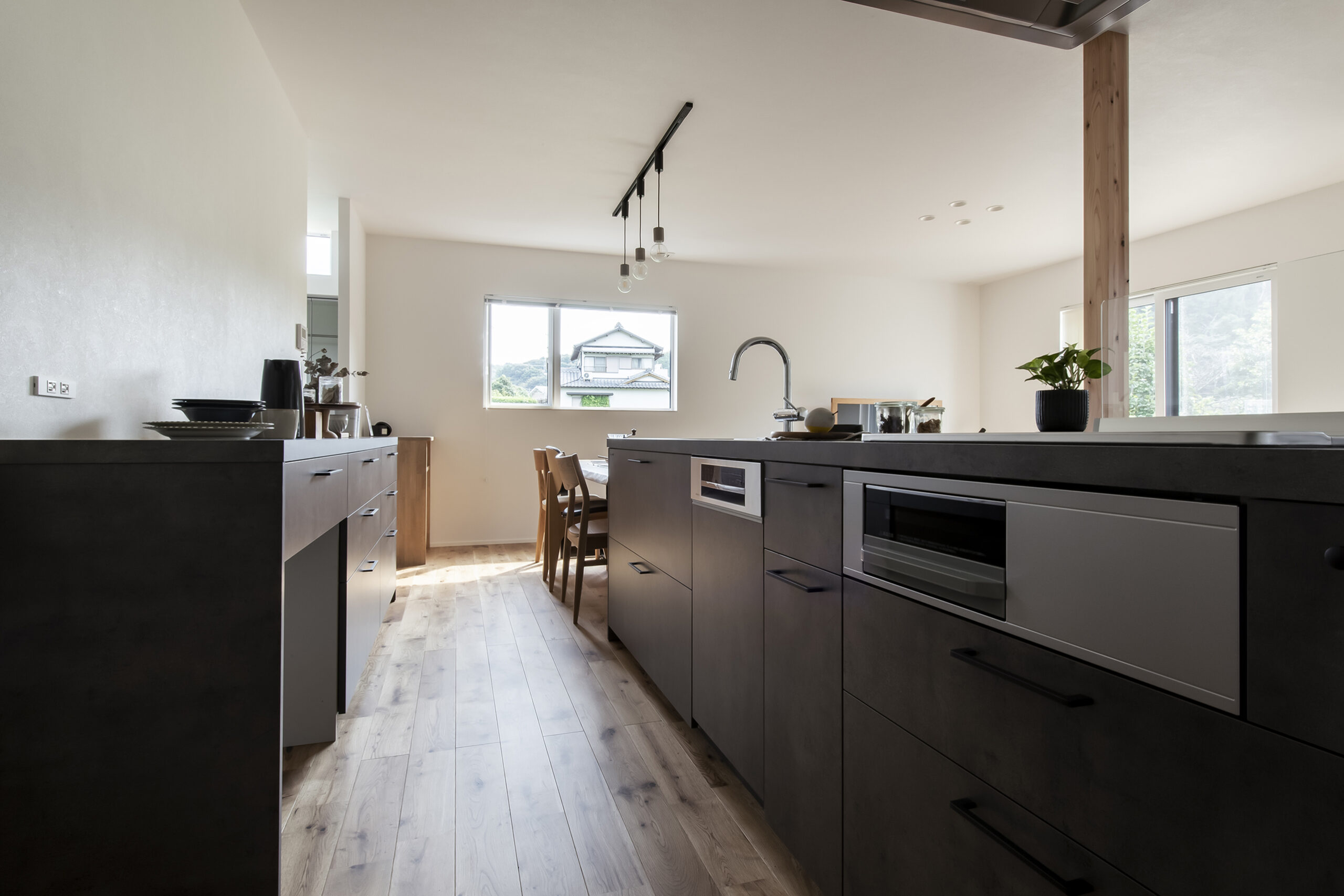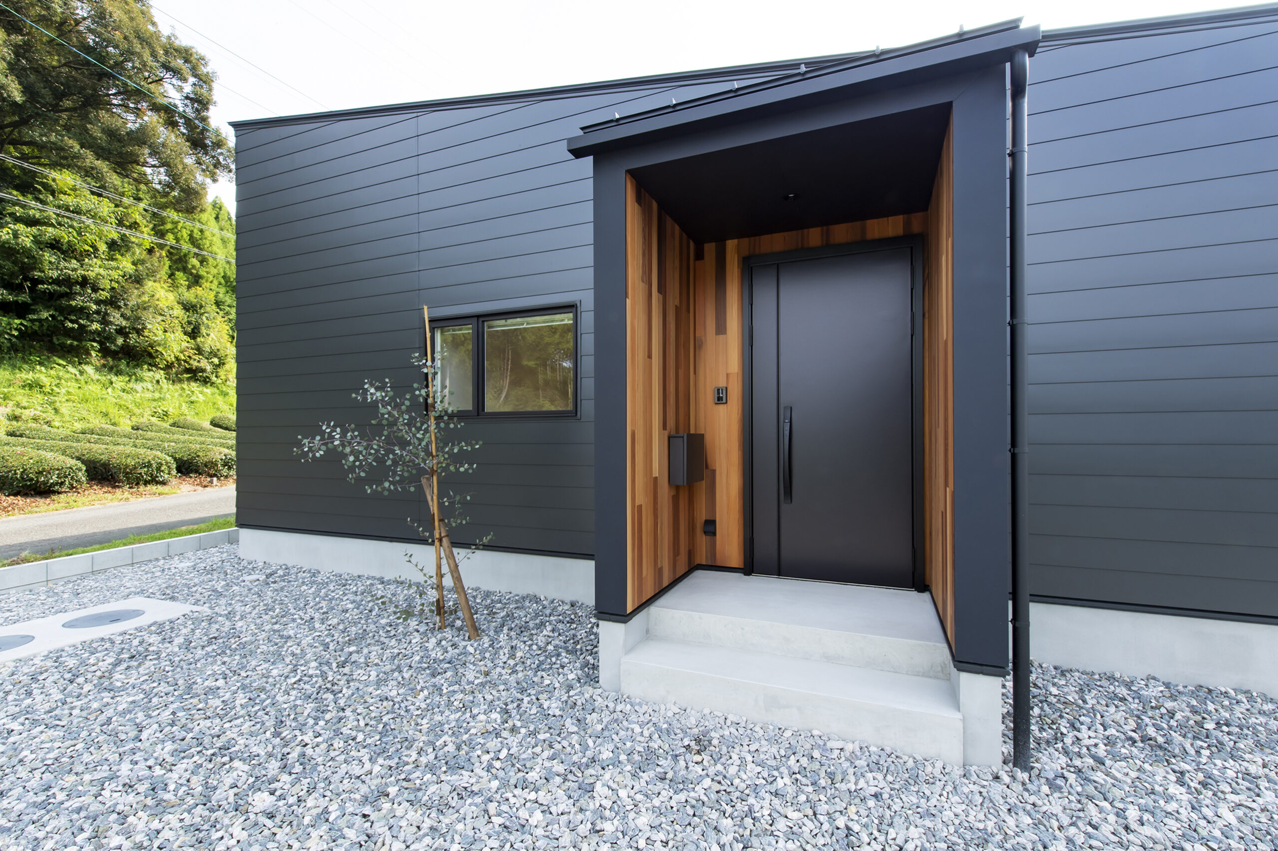 この平屋住宅は、洗練されたデザインと快適性のバランスが絶妙です。最初に目を引くのは、心地よさを漂わせる玄関ポーチ。ブラックのガルバリウムに、レッドシダーの温かみが加わることで、訪れるたびに安らぎを感じさせます。玄関を進むと、シンプルかつエレガントなホールが現れ、日々の生活を一層華やかにしてくれます。広々としたリビングは、自然の光をたっぷり取り込みながら、家族のリラックスタイムを豊かに演出。隣接する畳の空間は、日常の様々なシーンに合わせてアレンジ可能です。キッチンは先進のGRAFTEKTを取り入れ、調理をもっと楽しく、もっと魅力的に。ダイニングスペースとの一体感は、家族の会話やコミュニケーションを自然と増やしてくれます。インテリアの色彩は、一貫性を持ちつつも新鮮さを保ち、それがスタイリッシュな手洗いコーナーや機能的なクローゼットスペースにも反映されています。この住宅のすべての角度が、家族の幸せな日常を考え、その答えとなるよう設計されています。