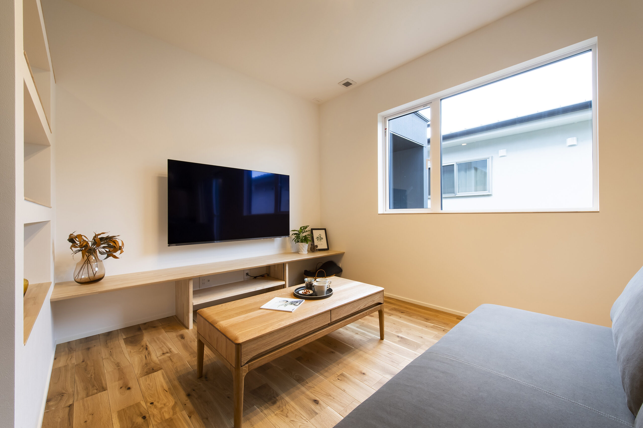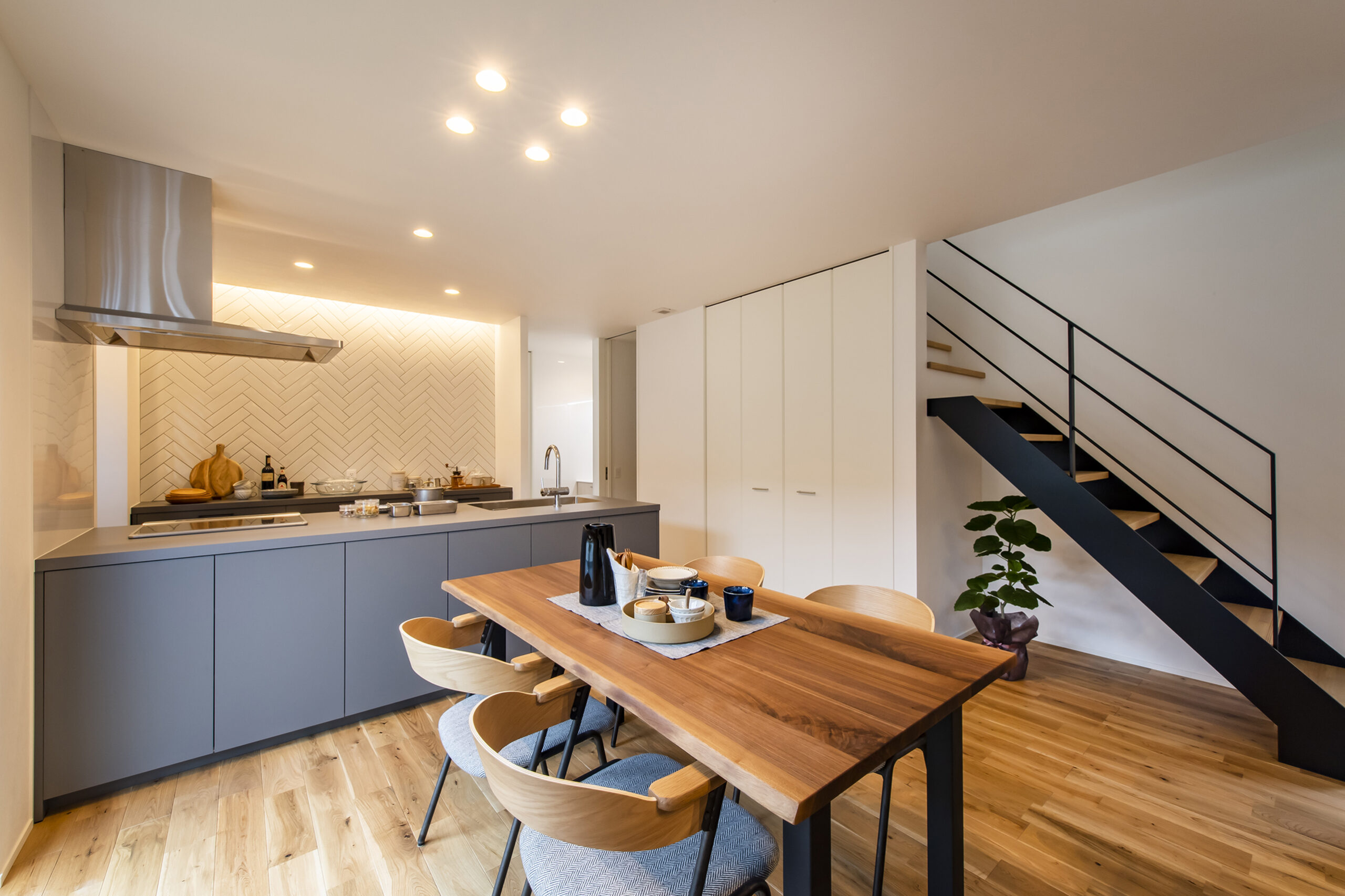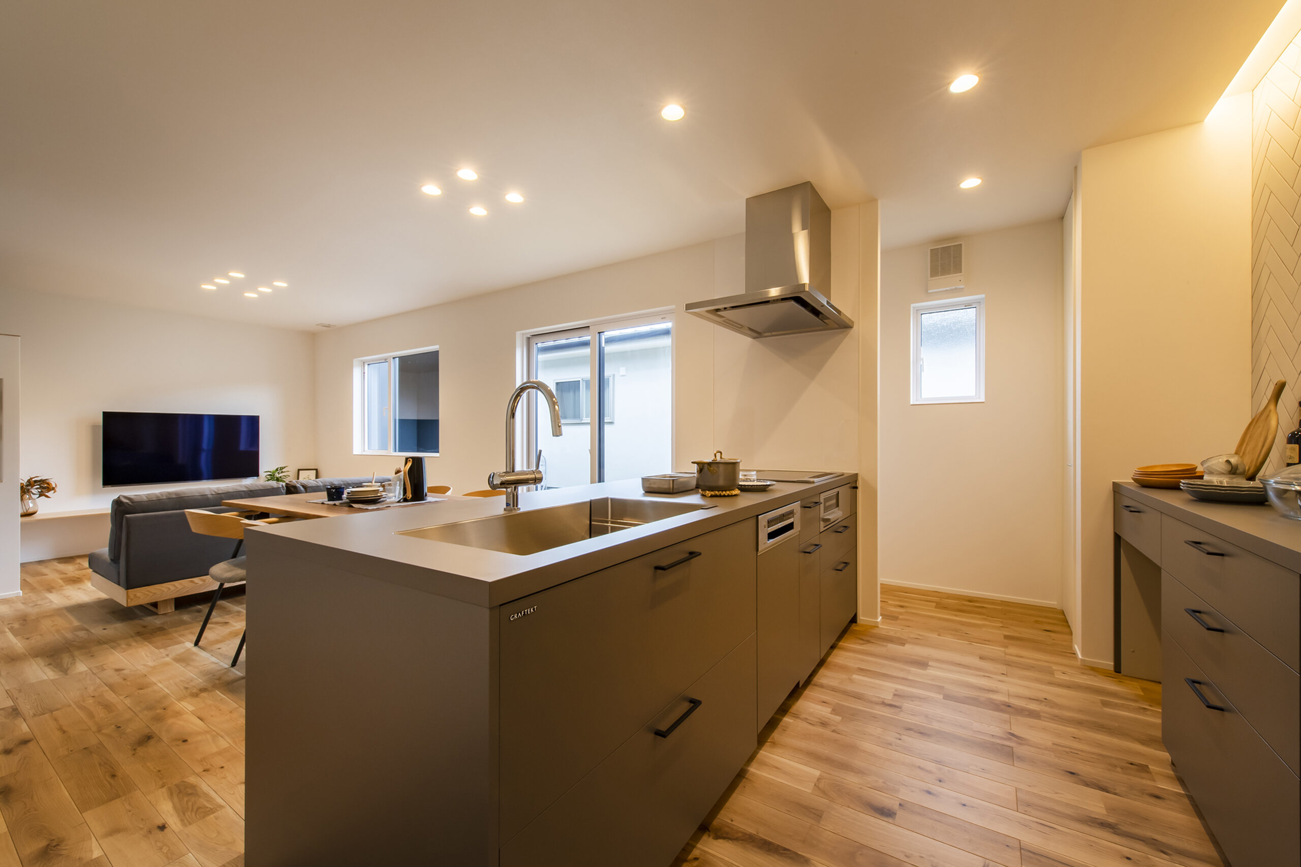 のどかな環境になじむとともに、カッコいい外観を持ち、板張りアクセントの大きな玄関ポーチと、プライベート空間(庭)を確保しつつ風通しも考慮された設計が特徴。広々としたLDKへ続く玄関を開けると、家族に丁度良い落ち着くリビングが広がります。キッチン背面に使用された大好きな白いタイルは、間接照明のあかりでより一層引き立てられ、毎日の料理が一層楽しくなります。また、冷蔵庫もスマートに収納され、キッチンスペースが広々としています。リビングに隣接する家族の書斎には、大型の本棚が設けられ、書籍を自由に飾ることができます。2階の主寝室は、たくさんの日差しを取り込む設計で、さらにWICも完備されています。バランスよく配置された収納スペースとともに、ここには家族の安心と快適さが詰まっています。