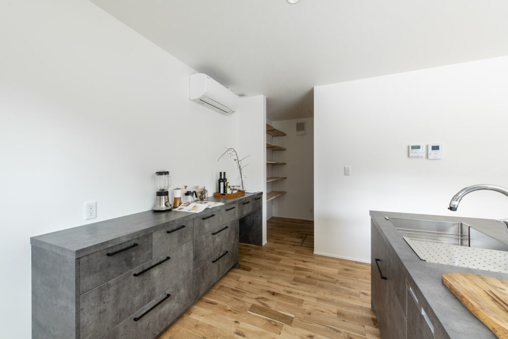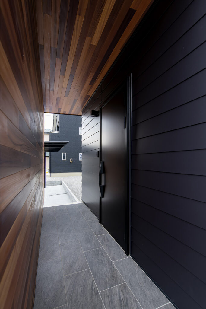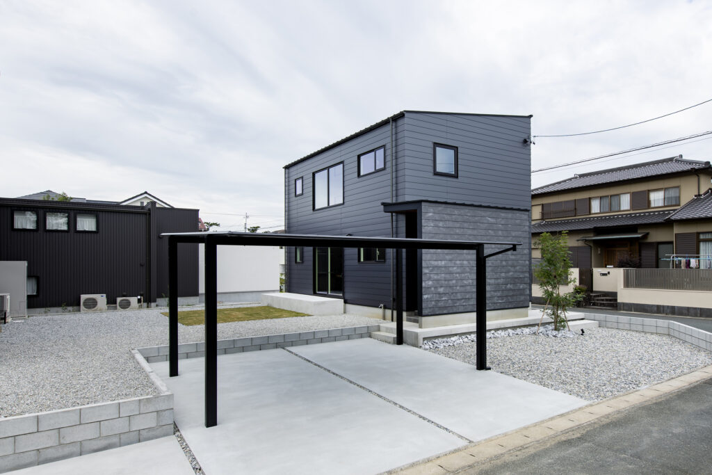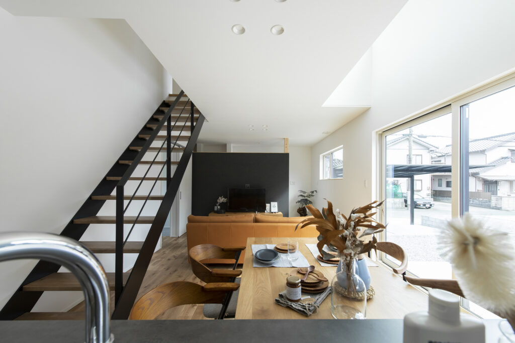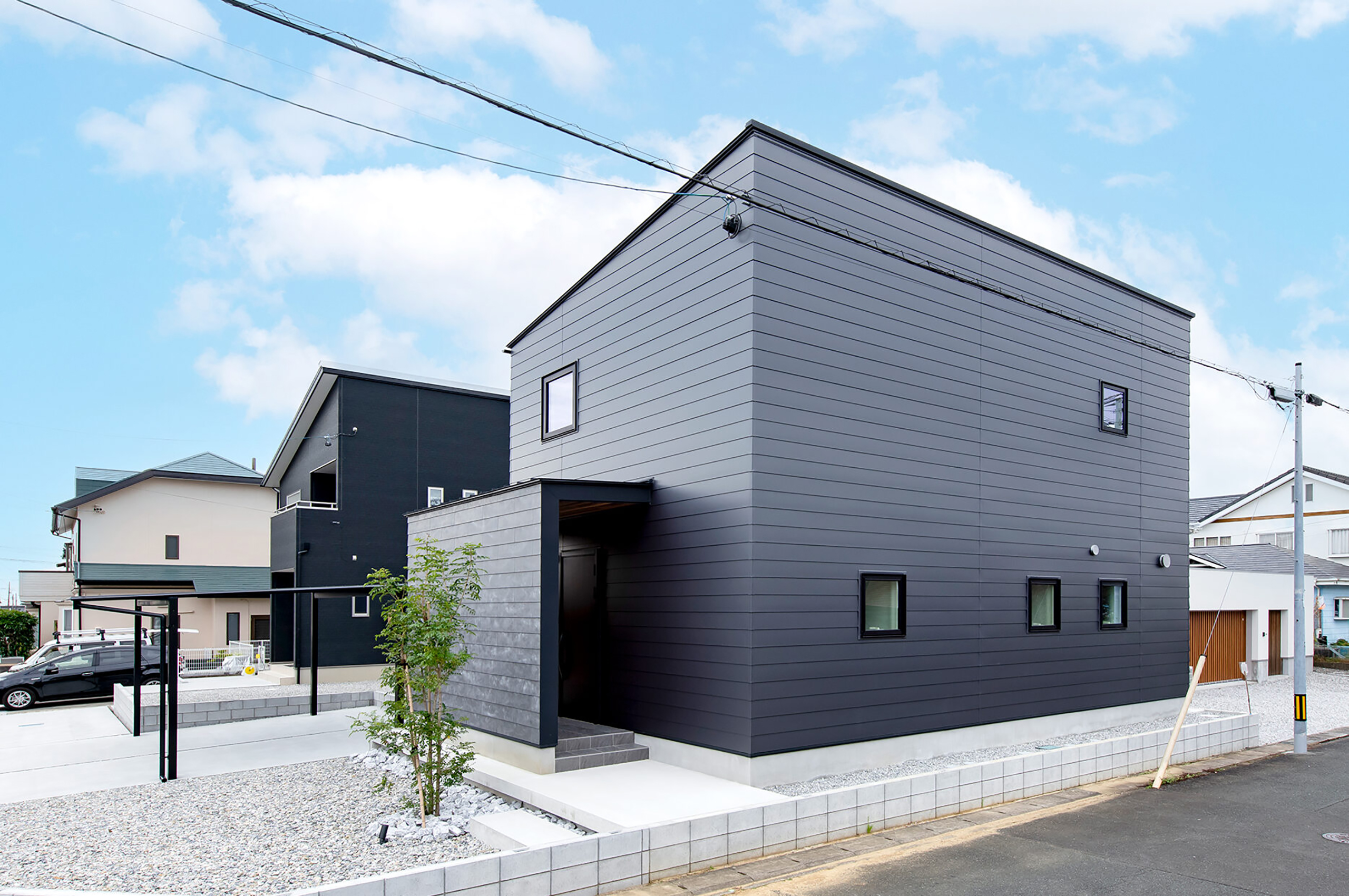 角地という立地をうまく活かした設計で、シンプルながらも機能的な空間を創り出しています。北面と東面は窓を小さくし、ブラック系の外壁でシックにまとめることで、都会的な雰囲気と存在感を放っています。シンプルな家事動線や豊富なキッチン収納など、家族に適した建物サイズと間取りを追求しています。