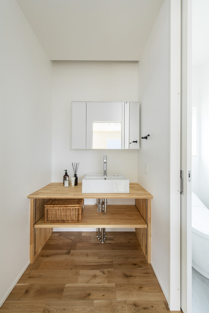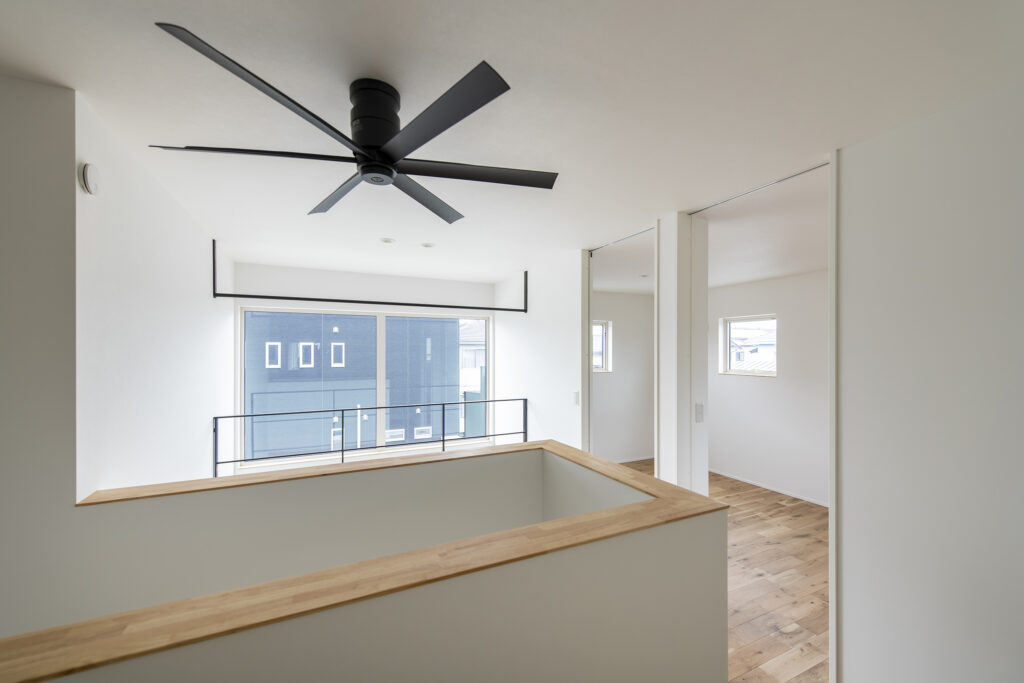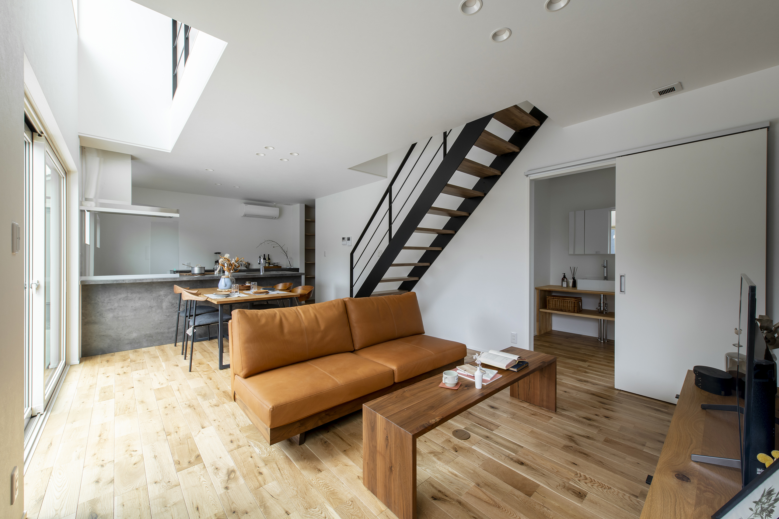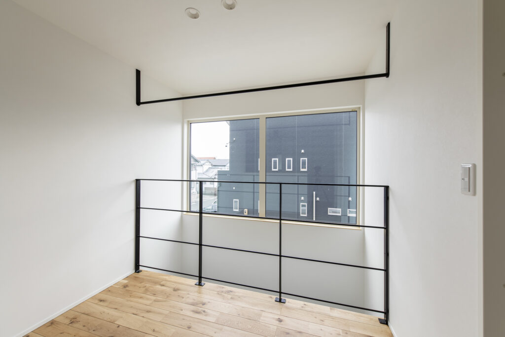 吹き抜けから差し込む光が明るく広がるLDKは、快適な生活空間を提供します。また、2階にはフリーな空間を設け、生活の変化に対応できる設計となっています。子供部屋は将来的に壁で仕切ることも可能で、家族の成長と共に間取りも変化できます。周りの視線を気にせずに使用できる室内干し空間もあり、生活がより快適になる配慮が行き届いています。